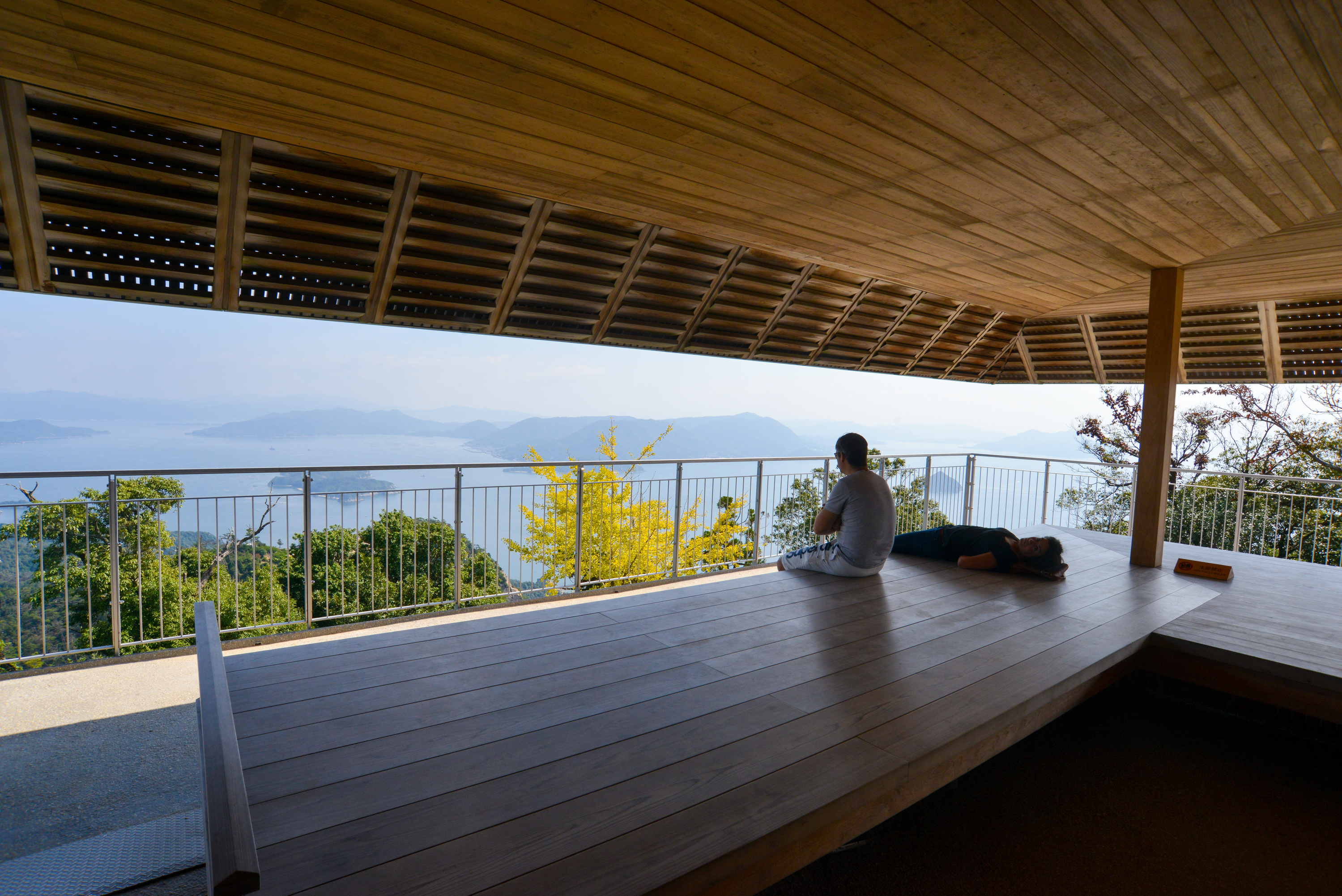 弥山展望台の2階「座の間」では、広い縁側があって気持ちいい。外で食べるとほんとに美味しい。